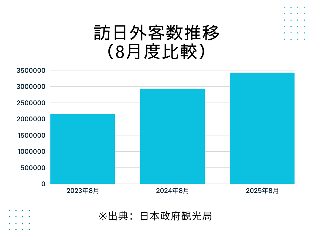 2025年8月の訪日外客数は350万人に迫っており、前年同月と比較すると約120%増、前々年同月と比べると約160%増となっています。